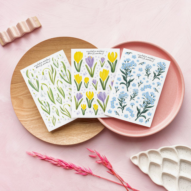 Valikoimasta löytyy monia valmiiksi koottuja tarrapaketteja erilaisin teemoin. Esimerkiksi Myötätuntopaketti sisältää 7 kpl A6-kokoisia tarra-arkkeja lempein muistutuksin ja ihanin kuvituksin.
